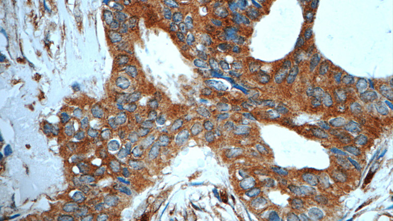 Immunohistochemistry of paraffin-embedded human breast cancer tissue slide using Catalog No:108252(ARFGAP3 Antibody) at dilution of 1:50 (under 40x lens)