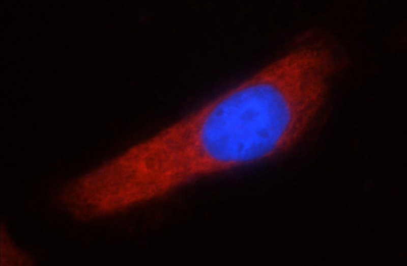 Immunofluorescent analysis of A431 cells using Catalog No:108252(ARFGAP3 Antibody) at dilution of 1:25 and Rhodamine-Goat anti-Rabbit IgG