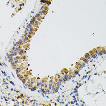 Immunohistochemistry of paraffin-embedded mouse lung using ARHGEF2 antibody at dilution of 1:100 (40x lens).