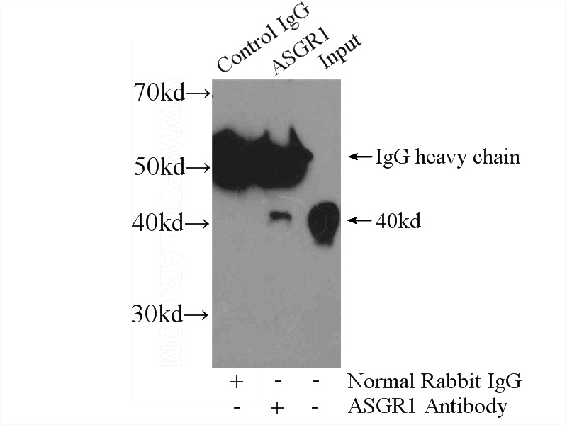 IP Result of anti-ASGR1 (IP:Catalog No:108226, 4ug; Detection:Catalog No:108226 1:500) with mouse liver tissue lysate 6400ug.