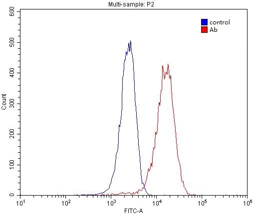 1X10^6 HepG2 cells were stained with 0.2ug ASGR1 antibody (Catalog No:108226, red) and control antibody (blue). Fixed with 4% PFA blocked with 3% BSA (30 min). Alexa Fluor 488-congugated AffiniPure Goat Anti-Rabbit IgG(H+L) with dilution 1:1500.