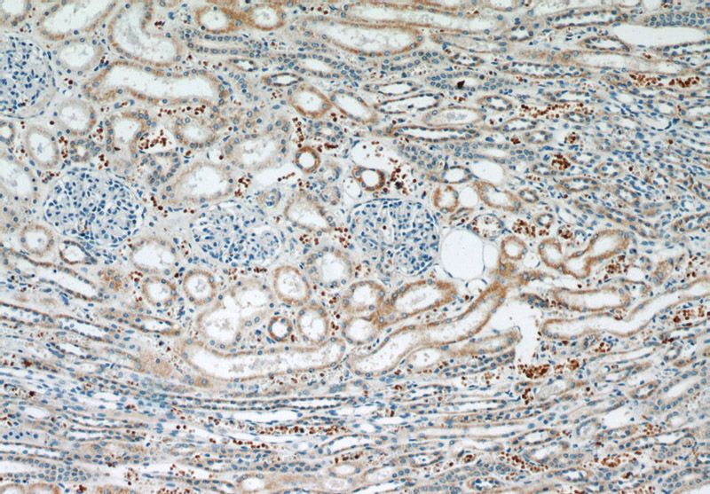 Immunohistochemistry of paraffin-embedded human kidney slide using Catalog No:108295(ATG3 Antibody) at dilution of 1:50