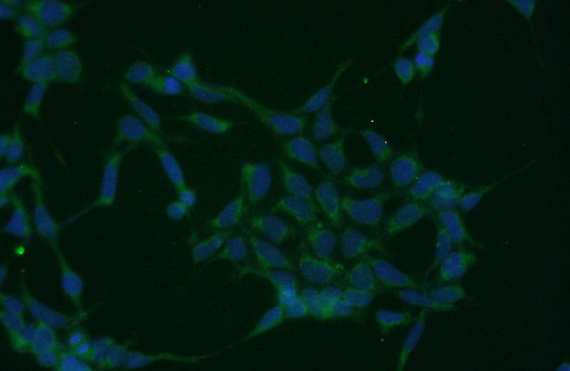 Immunofluorescent analysis of HEK-293 cells using Catalog No:108295(ATG3 Antibody) at dilution of 1:50 and Alexa Fluor 488-congugated AffiniPure Goat Anti-Rabbit IgG(H+L)