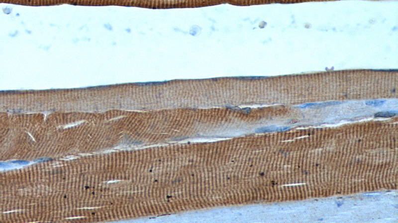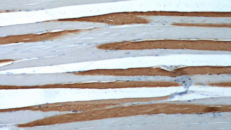 Immunohistochemistry of paraffin-embedded human skeletal muscle tissue slide using Catalog No:108347(ATP2A1 Antibody) at dilution of 1:200 (under 10x lens).