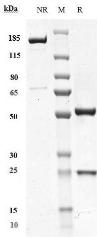 Anti-CSF1R / M-CSFR / CD115 Antibody (axatilimab) on SDS-PAGE under reducing (R) condition. The purity of the protein is greater than 95%.