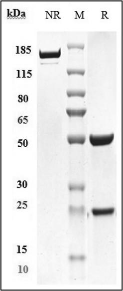 Anti-Amyloid Beta Antibody (bapineuzumab) on SDS-PAGE under reducing (R) condition. The purity of the protein is greater than 90%.