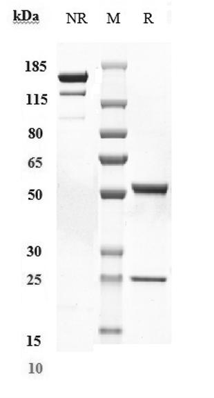 Anti-ACVR2B Antibody (bimagrumab) on SDS-PAGE under reducing (R) condition. The purity of the protein is greater than 95%.