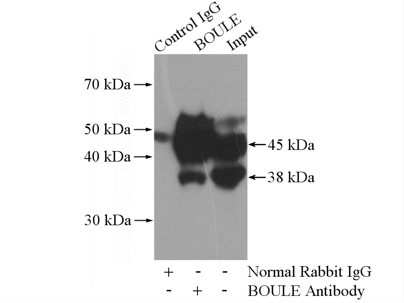 BOULE Rabbit Polyclonal antibody. Positive IHC detected in human testis tissue. Positive WB detected in mouse testis tissue. Positive IP detected in mouse testis tissue. Observed molecular weight by Western-blot: 38-42 kDa