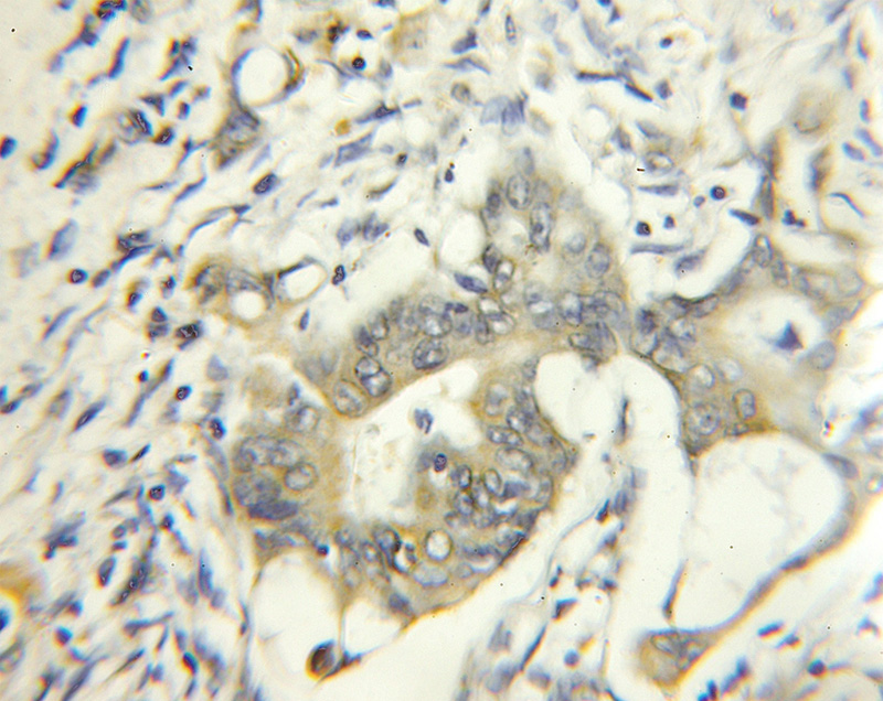 Immunohistochemical of paraffin-embedded human colon cancer using Catalog No:108553(BUB1B antibody) at dilution of 1:10 (under 10x lens)