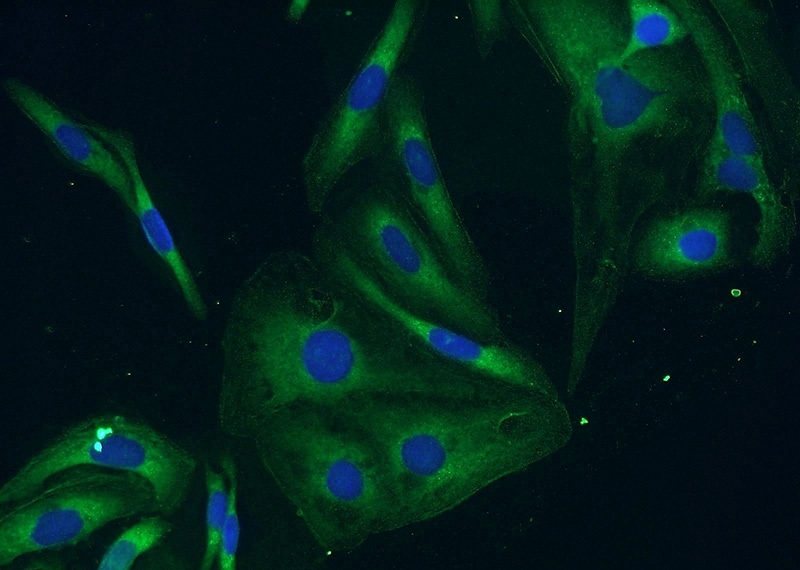 Immunofluorescent analysis of SKOV-3 cells using Catalog No:108553(BUB1B Antibody) at dilution of 1:50 and Alexa Fluor 488-congugated AffiniPure Goat Anti-Rabbit IgG(H+L)