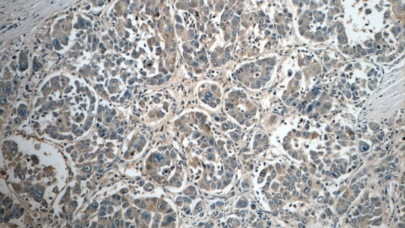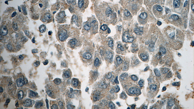 Immunohistochemistry of paraffin-embedded human liver cancer tissue slide using Catalog No:108765(CACNG1 Antibody) at dilution of 1:50 (under 40x lens)