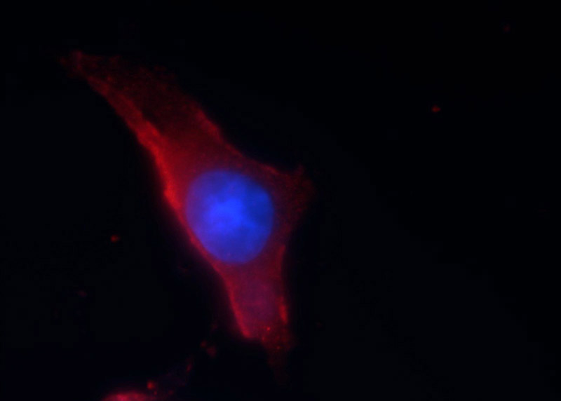 Immunofluorescent analysis of SH-SY5Y cells using Catalog No:108765(CACNG1 Antibody) at dilution of 1:25 and Rhodamine-Goat anti-Rabbit IgG