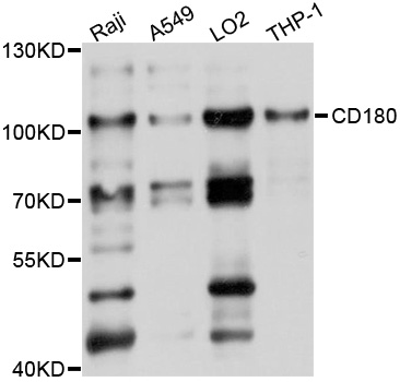Western blot analysis of extracts of various cell lines, using CD180 antibody at 1:1000 dilution.Secondary antibody: HRP Goat Anti-Rabbit IgG (H+L) at 1:10000 dilution.Lysates/proteins: 25ug per lane.Blocking buffer: 3% nonfat dry milk in TBST.Detection: ECL Basic Kit .Exposure time: 1s.