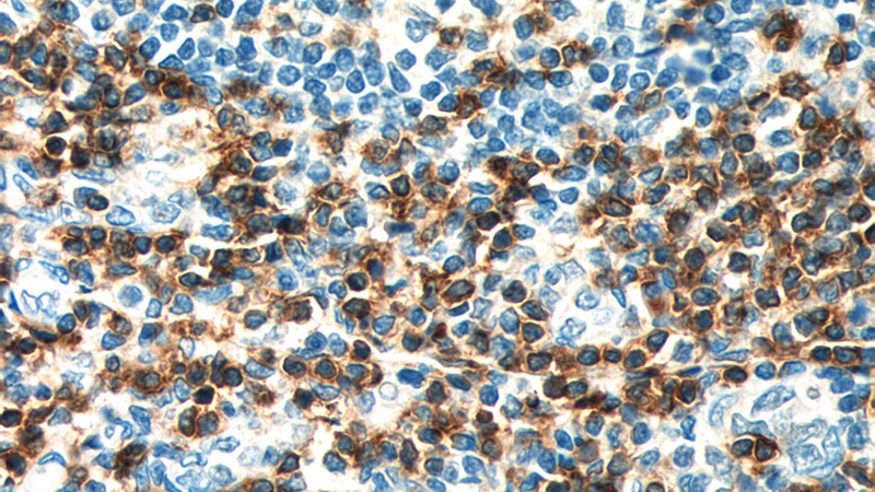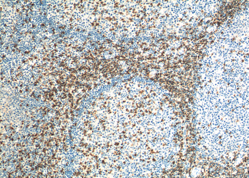 Immunohistochemistry of paraffin-embedded human tonsillitis tissue slide using Catalog No:107129(CD3E Antibody) at dilution of 1:200 (under 40x lens). heat mediated antigen retrieved with Tris-EDTA buffer(pH9).