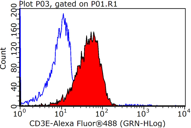 1X10^6 Jurkat cells were stained with 0.2ug CD3E antibody (Catalog No:107129, red) and control antibody (blue). Fixed with 90% MeOH blocked with 3% BSA (30 min). Alexa Fluor 488-congugated AffiniPure Goat Anti-Mouse IgG(H+L) with dilution 1:1000.