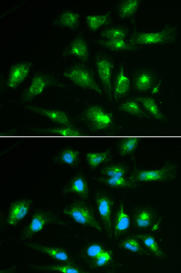 Immunofluorescence analysis of HepG2 cells using CD46 antibody . Blue: DAPI for nuclear staining.