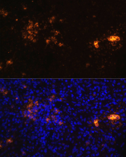 Immunofluorescence analysis of rat spleen using CD70 antibody at dilution of 1:100. Blue: DAPI for nuclear staining.