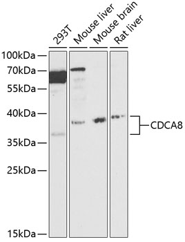 Western blot analysis of extracts of various cell lines, using CDCA8 antibody at 1:1000 dilution.Secondary antibody: HRP Goat Anti-Rabbit IgG (H+L) at 1:10000 dilution.Lysates/proteins: 25ug per lane.Blocking buffer: 3% nonfat dry milk in TBST.Detection: ECL Basic Kit .Exposure time: 60s.
