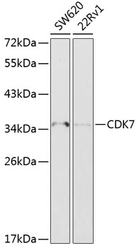 Western blot analysis of extracts of various cell lines, using CDK7 antibody at 1:1000 dilution.Secondary antibody: HRP Goat Anti-Rabbit IgG (H+L) at 1:10000 dilution.Lysates/proteins: 25ug per lane.Blocking buffer: 3% nonfat dry milk in TBST.Detection: ECL Basic Kit .Exposure time: 10min.