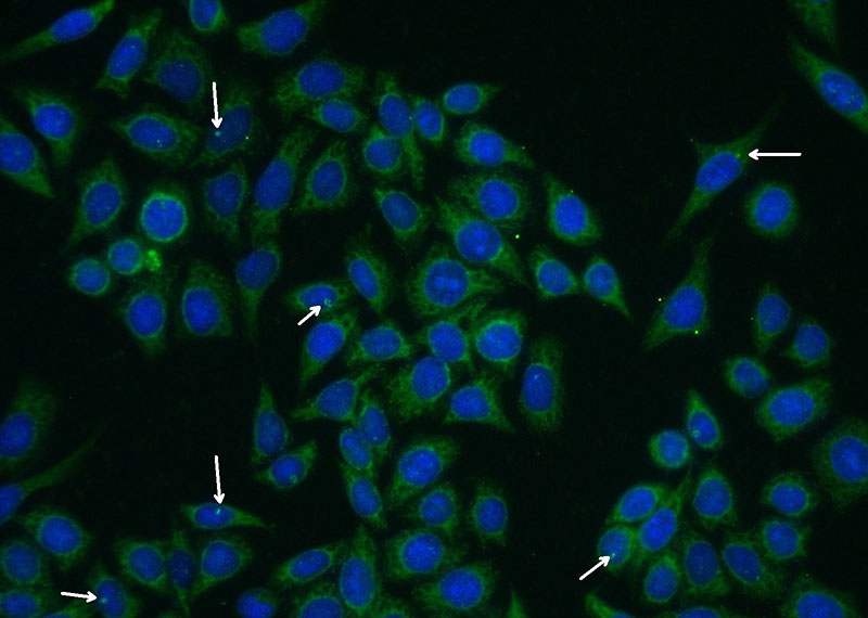 Immunofluorescent analysis of (-20oc Ethanol) fixed HeLa cells using Catalog No:109179(CEP290 Antibody) at dilution of 1:50 and Alexa Fluor 488-congugated AffiniPure Goat Anti-Rabbit IgG(H+L)
