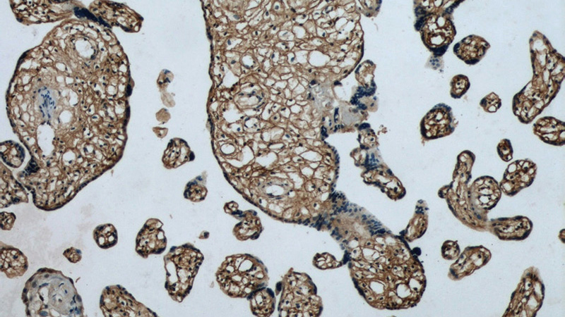Immunohistochemical of paraffin-embedded human placenta using Catalog No:109179(CEP290 antibody) at dilution of 1:50 (under 10x lens)