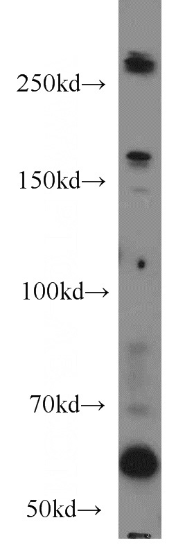 HEK-293 cells were subjected to SDS PAGE followed by western blot with Catalog No:109179(CEP290 antibody) at dilution of 1:500