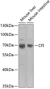 Western blot analysis of extracts of various cell lines, using CFI antibody at 1:1000 dilution.Secondary antibody: HRP Goat Anti-Rabbit IgG (H+L) at 1:10000 dilution.Lysates/proteins: 25ug per lane.Blocking buffer: 3% nonfat dry milk in TBST.Detection: ECL Basic Kit .Exposure time: 90s.