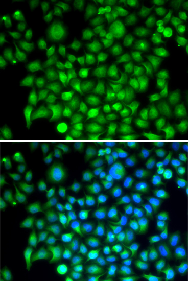 Immunofluorescence analysis of HeLa cells using CFI antibody . Blue: DAPI for nuclear staining.