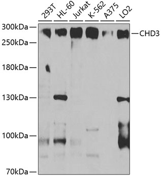 Western blot analysis of extracts of various cell lines, using CHD3 antibody at 1:1000 dilution.Secondary antibody: HRP Goat Anti-Mouse IgG (H+L) at 1:10000 dilution.Lysates/proteins: 25ug per lane.Blocking buffer: 3% nonfat dry milk in TBST.Detection: ECL Enhanced Kit .Exposure time: 10s.