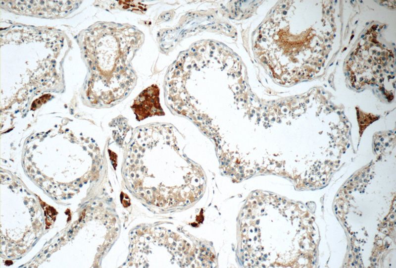 Immunohistochemistry of paraffin-embedded human testis tissue slide using Catalog No:109231(CHMP1A Antibody) at dilution of 1:50 (under 10x lens)