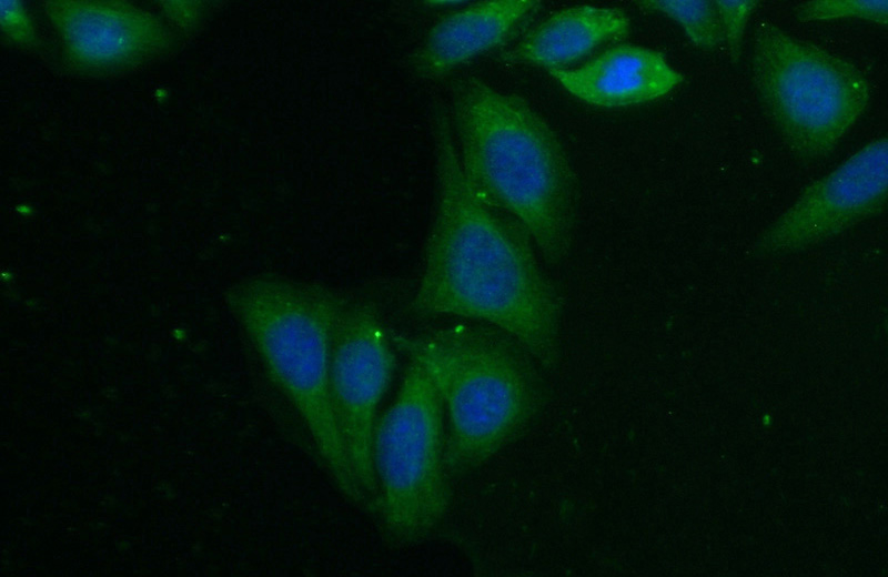 Immunofluorescent analysis of (-20oc Ethanol) fixed HepG2 cells using Catalog No:109231(CHMP1A Antibody) at dilution of 1:50 and Alexa Fluor 488-congugated AffiniPure Goat Anti-Rabbit IgG(H+L)