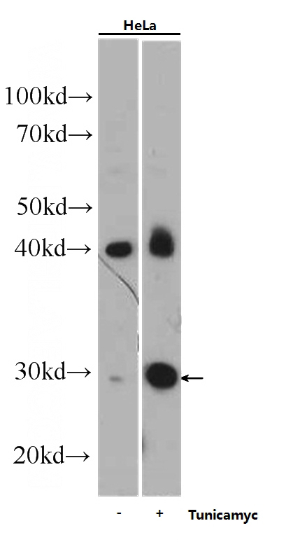 Tunicamycin treated HeLa cells were subjected to SDS PAGE followed by western blot with Catalog No:107155(CHOP; GADD153 Antibody) at dilution of 1:1000