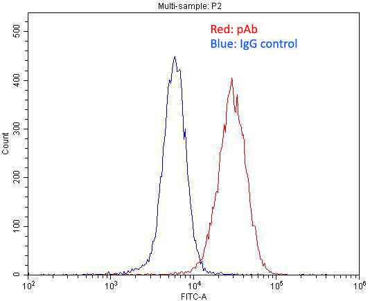 1X10^6 SH-SY5Y cells were stained with 0.2ug CHRNB4 antibody (Catalog No:109286, red) and control antibody (blue). Fixed with 4% PFA blocked with 3% BSA (30 min). Alexa Fluor 488-congugated AffiniPure Goat Anti-Rabbit IgG(H+L) with dilution 1:1500.