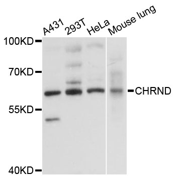 Western blot analysis of extracts of various cell lines, using CHRND antibody at 1:3000 dilution.Secondary antibody: HRP Goat Anti-Rabbit IgG (H+L) at 1:10000 dilution.Lysates/proteins: 25ug per lane.Blocking buffer: 3% nonfat dry milk in TBST.Detection: ECL Basic Kit .Exposure time: 30s.