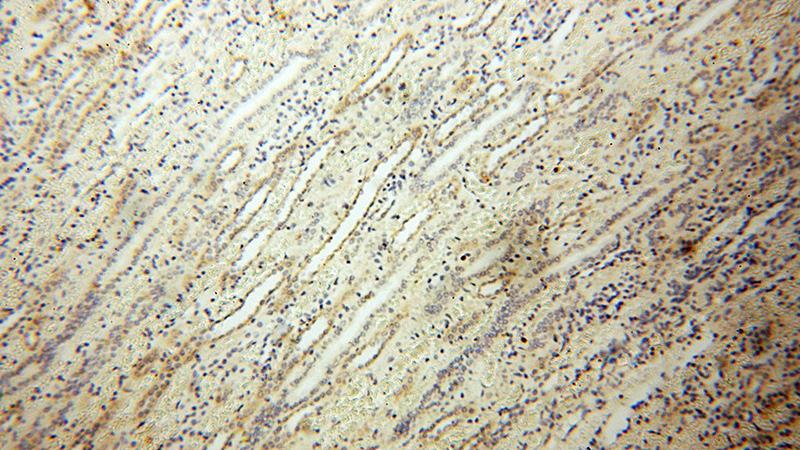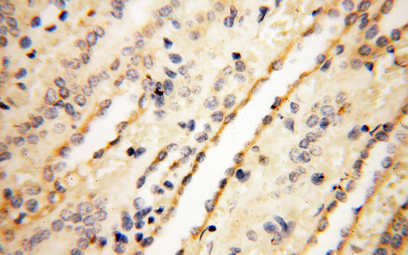 Immunohistochemical of paraffin-embedded human kidney using Catalog No:109345(CLCNKA antibody) at dilution of 1:100 (under 40x lens)