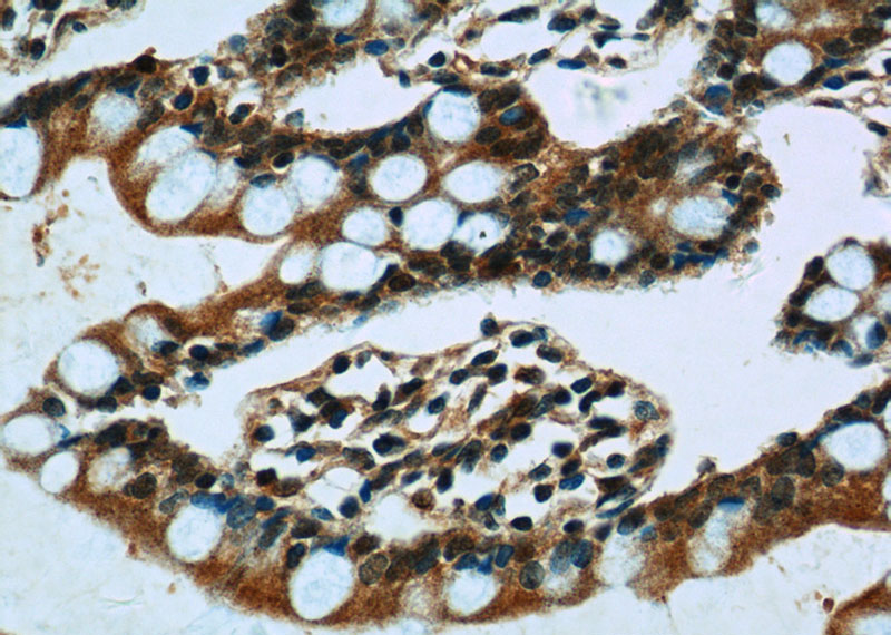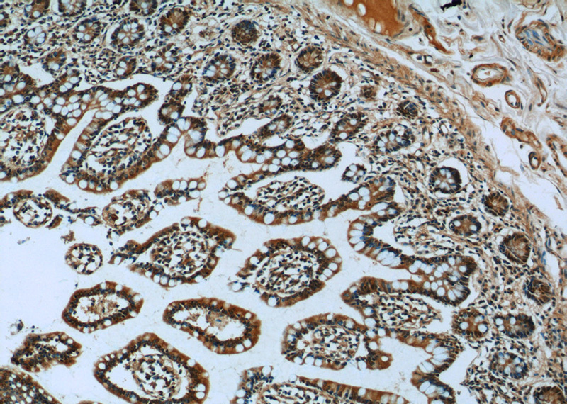 Immunohistochemistry of paraffin-embedded human small intestine tissue slide using Catalog No:109388(CLIC1 Antibody) at dilution of 1:50 (under 10x lens)