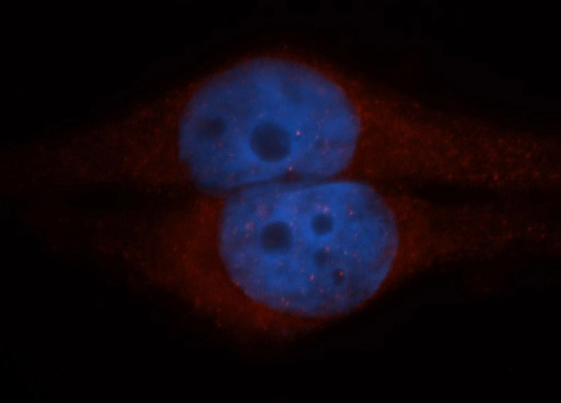 Immunofluorescent analysis of HepG2 cells, using CLIC1 antibody Catalog No:109388 at 1:50 dilution and Rhodamine-labeled goat anti-rabbit IgG (red). Blue pseudocolor = DAPI (fluorescent DNA dye).