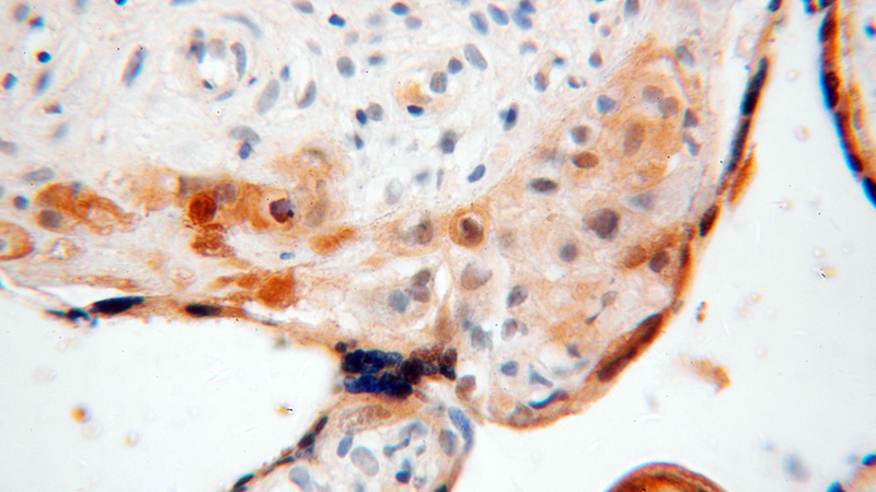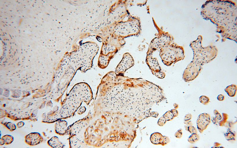 Immunohistochemical of paraffin-embedded human placenta using Catalog No:109389(CLIC3 antibody) at dilution of 1:50 (under 10x lens)