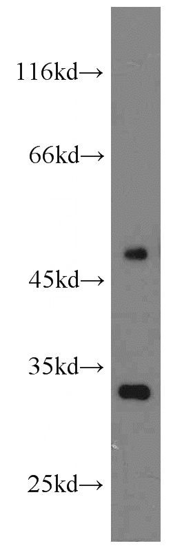 HeLa cells were subjected to SDS PAGE followed by western blot with Catalog No:109389(CLIC3 antibody) at dilution of 1:800