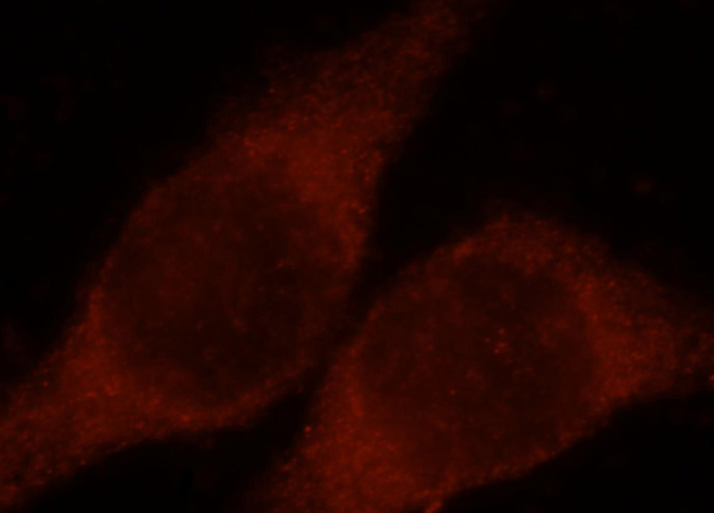 Immunofluorescent analysis of MCF-7 cells, using CLIC3 antibody Catalog No:109389 at 1:25 dilution and Rhodamine-labeled goat anti-rabbit IgG (red).