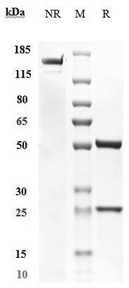 Anti-MUC1 Antibody (clivatuzumab) on SDS-PAGE under reducing (R) condition. The purity of the protein is greater than 95%.