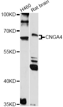 Western blot analysis of extracts of various cell lines, using CNGA4 antibody at 1:1000 dilution.Secondary antibody: HRP Goat Anti-Rabbit IgG (H+L) at 1:10000 dilution.Lysates/proteins: 25ug per lane.Blocking buffer: 3% nonfat dry milk in TBST.Detection: ECL Basic Kit .Exposure time: 90s.