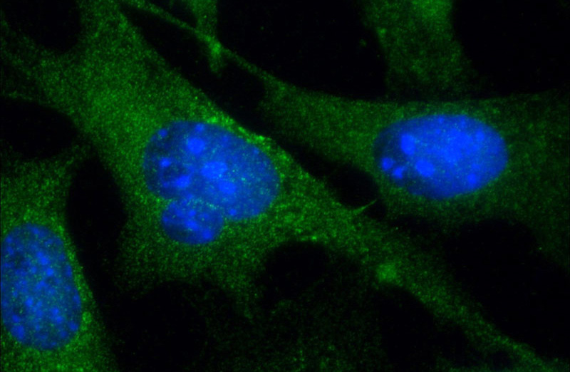 Immunofluorescent analysis of (-20oc Ethanol) fixed NIH/3T3 cells using Catalog No:109365(Cofilin Antibody) at dilution of 1:50 and Alexa Fluor 488-congugated AffiniPure Goat Anti-Rabbit IgG(H+L)
