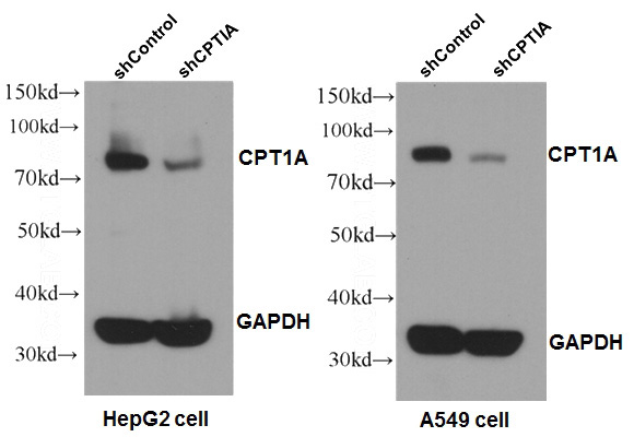 WB results of CPT1A antibody (1:1000) with shCPT1A-A549 and shCPT1A-HepG2 cells. shControl-A549 and shControl-HepG2 as positive control.