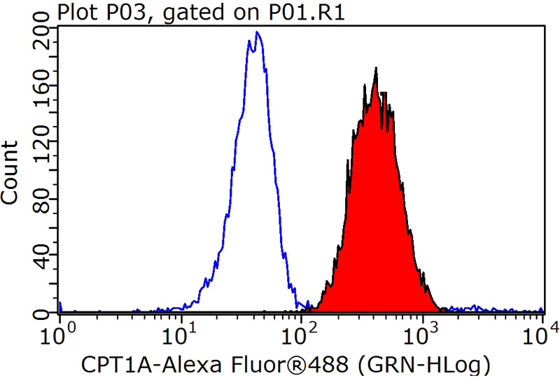 1X10^6 HeLa cells were stained with 0.2ug CPT1A antibody (Catalog No:109530, red) and control antibody (blue). Fixed with 90% MeOH blocked with 3% BSA (30 min). Alexa Fluor 488-congugated AffiniPure Goat Anti-Rabbit IgG(H+L) with dilution 1:1000.