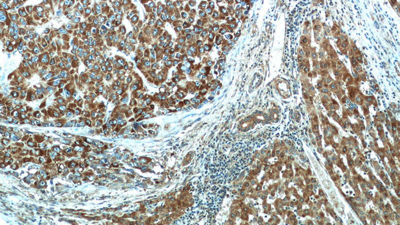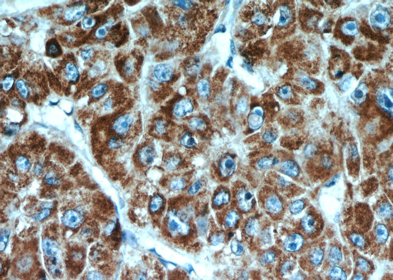 Immunohistochemical of paraffin-embedded human liver cancer using Catalog No:109530(CPT1A antibody) at dilution of 1:100 (under 40x lens)