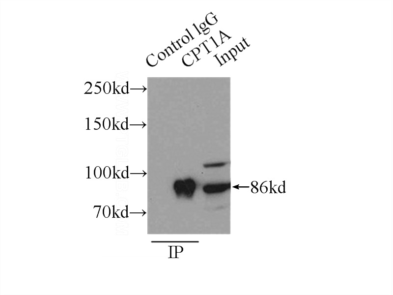 CPT1A Rabbit Polyclonal antibody. Positive IF detected in Hela cells. Positive IHC detected in human liver cancer tissue, human kidney tissue. Positive FC detected in HeLa cells. Positive WB detected in HepG2 cells, A549 cells, human heart tissue, human kidney tissue, L02 cells, MCF7 cells, mouse kidney tissue, mouse liver tissue, rat kidney tissue. Positive IP detected in HepG2 cells. Observed molecular weight by Western-blot: 86 kDa