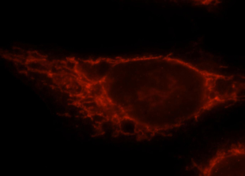 Immunofluorescent analysis of Hela cells, using CPT1A antibody Catalog No:109530 at 1:25 dilution and Rhodamine-labeled goat anti-rabbit IgG (red).