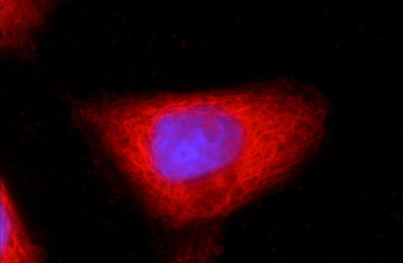 Immunofluorescent analysis of A431 cells using Catalog No:107179(CSK Antibody) at dilution of 1:50 and Rhodamine-Goat anti-Mouse IgG