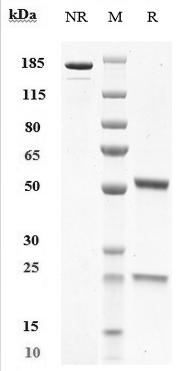Anti-Serum Amyloid P / SAP Antibody (dezamizumab) on SDS-PAGE under reducing (R) condition. The purity of the protein is greater than 90%.